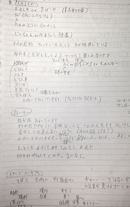 絵を描く前に、テーマを決めます。決めたテーマをもとに、登場人物、お話、入れたいもの、使う色、などを色々考えておきます。