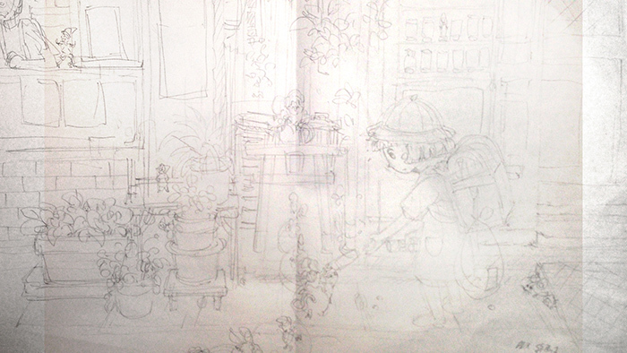この絵では、主人公の女の子と、小人たちを目立たせるために、周りのものと比べて、色の塗り方を変えるという計画を立てました。