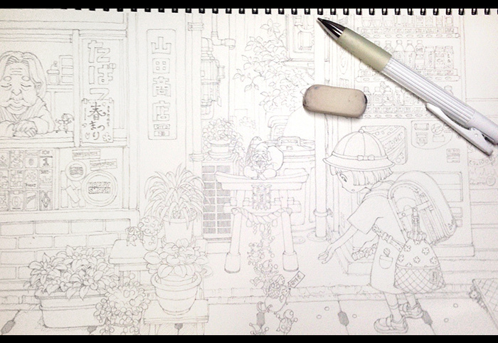 ラフを参考にしながら、スケッチブックにシャープペンシルで線を描きます。